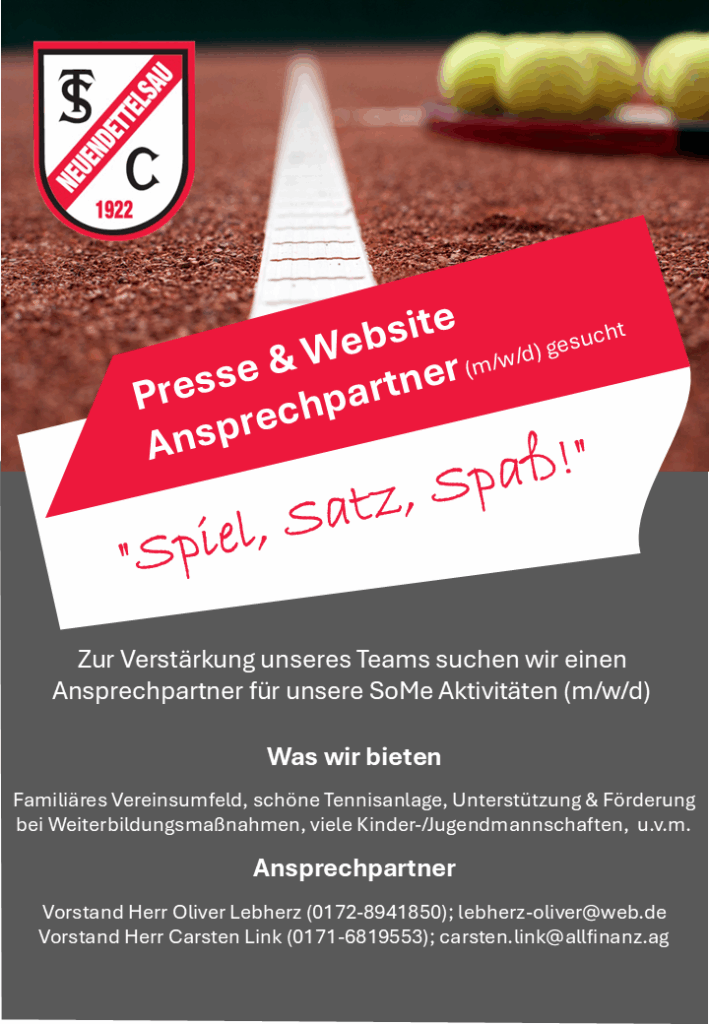 Die Tennisabteilung des TSC Neuendettelsau sucht helfende Hände und frische Ideen, denn ein Verein funktioniert nur, wenn viele zusammenhalten und helfen. Dein Engagement macht den Unterschied!